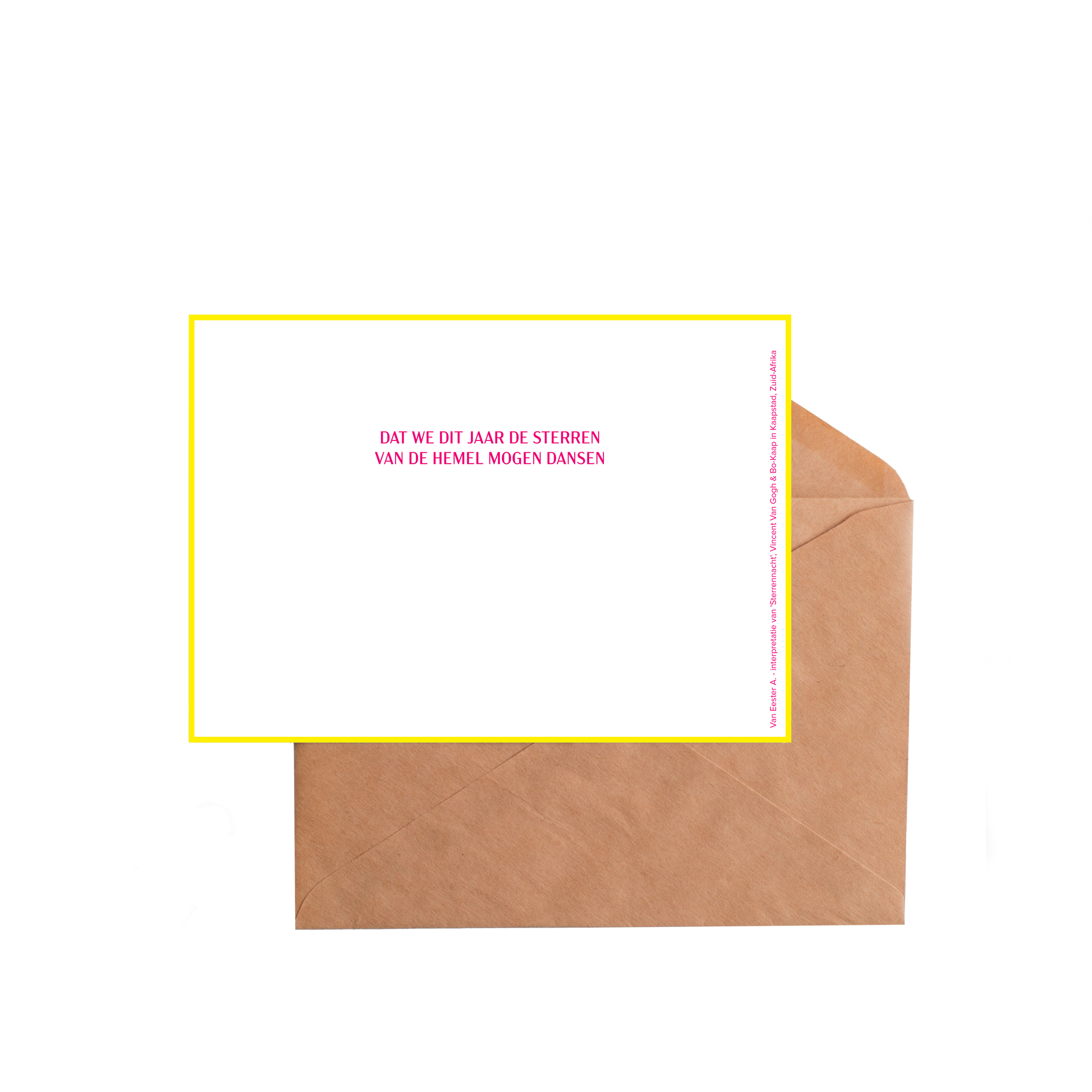 - achterkant met tekst: 'Dat we dit jaar de sterren van de hemel mogen dansen'